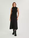 Malha retilínea encorpada - Sem mangas e gola média - Detalhe de nervuras texturizadas com efeito avesso - Modelagem evasê midi.